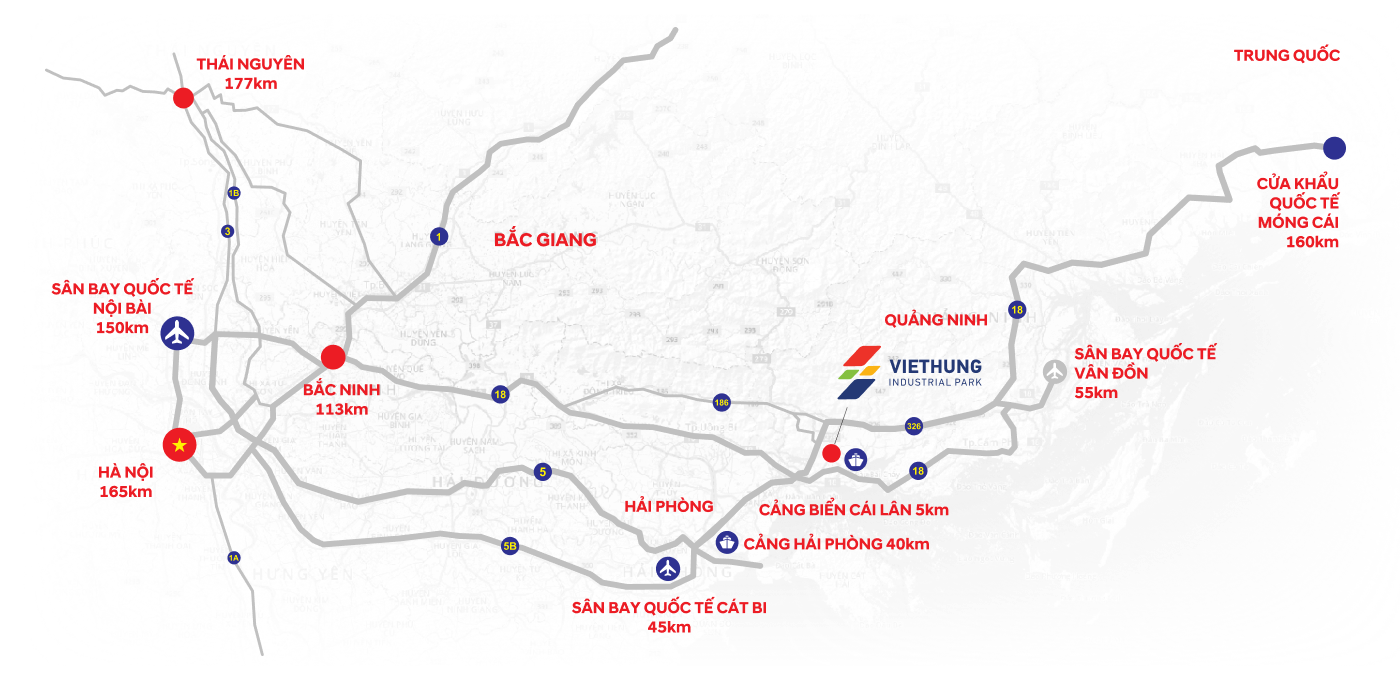 Tổ hợp chuyên đề công nghiệp ô tô và phụ trợ Thành Công Việt Hưng do TC Group làm chủ đầu tư tọa lạc tại Khu công nghiệp Việt Hưng, tỉnh Quảng Ninh. Đây là vị trí thuận tiện cho việc kết nối giao thông:
